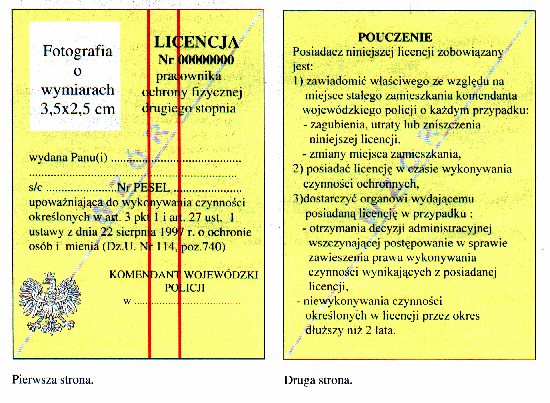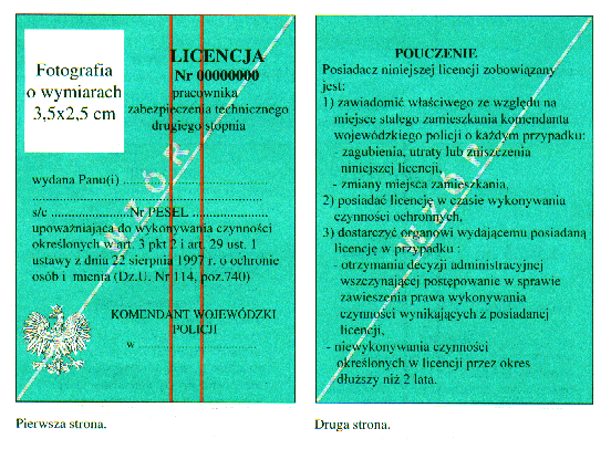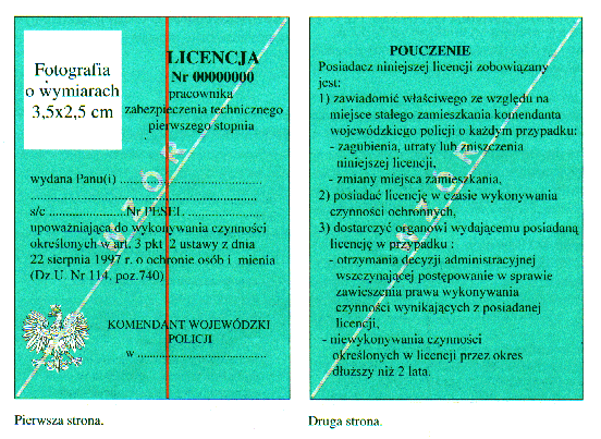 | Tytuł: | Wzór i tryb wydawania licencji pracownika ochrony fizycznej i licencji pracownika zabezpieczenia technicznego oraz tryb i częstotliwość wydawania przez organy Policji opinii o pracownikach ochrony. |