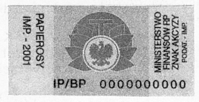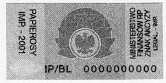 | I | Rys. | Banderola jest zadrukowana jednostronnie i ma wykonane techniką offsetową dwukolorowe tło: jasnoróżowe (na marginesach) i pomarańczowe (w centralnej części banderoli, nieobejmujące marginesów), napisy koloru czarnego umieszczone w czterech równoległych wierszach wzdłuż prawego marginesu banderoli: "MINISTERSTWO FINANSÓW RP ZNAK AKCYZY LEGAL. - IMP." oraz w dwóch równoległych wierszach biegnących wzdłuż lewego marginesu banderoli: "PAPIEROSY IMP. - 2001" ("2001" stanowi przykład określenia roku wytworzenia banderoli), w dolnej części banderoli, pod rozetą oznaczenie serii i numeru ewidencyjnego2), rozetę koloru granatowego, powtarzający się mikrotekst negatywowo-pozytywowy "RZECZPOSPOLITA POLSKA MINISTERSTWO FINANSÓW" wokół orła i mikrotekst pozytywowy "POLSKA MF" okalający górną część rozety, zabezpieczenie w lewym dolnym rogu banderoli wykonane farbą termochromową - pod wpływem temperatury staje się widoczny jasny element w postaci "łezki"4), włókna zabezpieczające widoczne w kolorze bordowym, granatowym i zielonym | 45 | 22 |