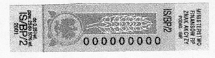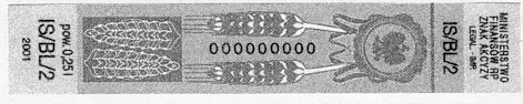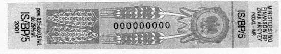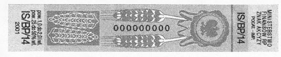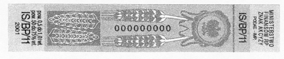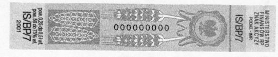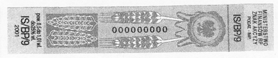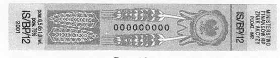 | II.2 | 5-20 | Banderola jest zadrukowana jednostronnie i ma wykonane techniką offsetową dwukolorowe tło: jasnoniebieskie (na marginesach) i ciemniejsze niebieskie (w centralnej części banderoli, nieobejmujące marginesów), napisy koloru czarnego umieszczone w czterech równoległych wierszach wzdłuż prawego marginesu banderoli: "MINISTERSTWO FINANSÓW RP ZNAK AKCYZY PODAT.-IMP." oraz napisy w czterech równoległych wierszach, biegnące wzdłuż lewego marginesu banderoli, określające pojemność opakowania jednostkowego, zawartość procentową alkoholu w wyrobie, serię oraz rok wytworzenia banderoli, dodatkowo równolegle do prawego marginesu banderoli oznaczenie serii, a w centralnej części banderoli numeru ewidencyjnego2). Banderola ma także wykonane techniką wklęsłodrukową dwie rozety koloru granatowego: w kształcie orła z dwoma kłosami umieszczoną po prawej stronie banderoli i rozetę prostokątną z dwoma kłosami, z widocznym efektem kątowym w postaci litery "S", umieszczoną po lewej stronie banderoli, powtarzający się mikrotekst negatywowo-pozytywowy "RZECZPOSPOLITA POLSKA MINISTERSTWO FINANSÓW" wokół orła i mikrotekst pozytywowy "RZECZPOSPOLITA POLSKA MINISTERSTWO FINANSÓW" na liściach kłosów oraz mikrotekst negatywowo-pozytywowy "POLSKA MF", prostopadły do dłuższego boku banderoli przy prawym marginesie banderoli, a także mikrotekst pozytywowy "POLSKA MF" wokół prostokątnej rozety, włókna zabezpieczające widoczne w kolorze bordowym, granatowym i zielonym | 90 | 16 |