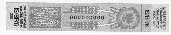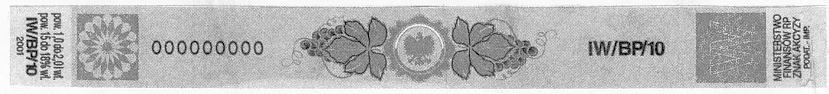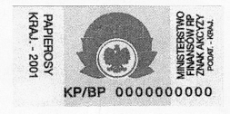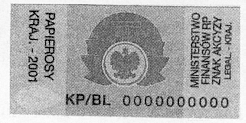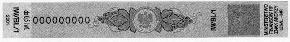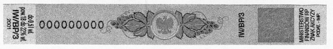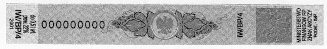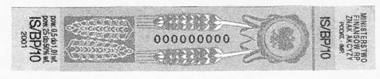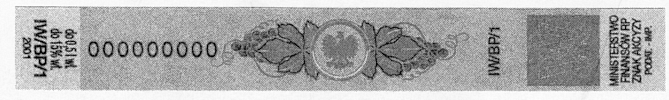 | IV | Rys. | Banderola jest zadrukowana jednostronnie i ma wykonane techniką offsetową dwukolorowe tło: jasnozielone (na marginesach) i ciemniejsze zielone (w centralnej części banderoli, nieobejmujące marginesów), napisy koloru czarnego umieszczone w czterech równoległych wierszach wzdłuż prawego marginesu banderoli: "MINISTERSTWO FINANSÓW RP ZNAK AKCYZY PODAT. - KRAJ." oraz w dwóch równoległych wierszach biegnących wzdłuż lewego marginesu banderoli: "PAPIEROSY KRAJ. - 2001" ("2001" stanowi przykład określenia roku wytworzenia banderoli), w dolnej części banderoli, pod rozetą oznaczenie serii i numeru ewidencyjnego2), rozetę koloru zielonego, powtarzający się mikrotekst negatywowo-pozytywowy "RZECZPOSPOLITA POLSKA MINISTERSTWO FINANSÓW" wokół orła i mikrotekst pozytywowy "POLSKA MF" okalający górną część rozety, zabezpieczenie w lewym dolnym rogu banderoli wykonane farbą termochromową - pod wpływem temperatury staje się widoczny jasny element w postaci "łezki"4), włókna zabezpieczające widoczne w kolorze bordowym, granatowym i zielonym | 45 | 22 |