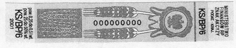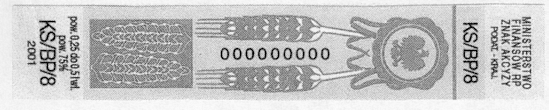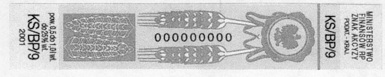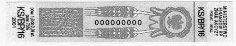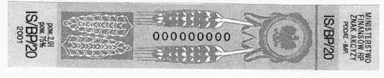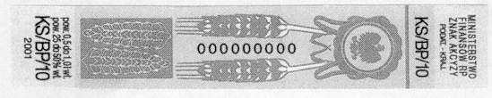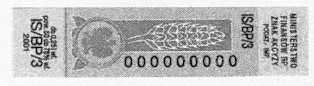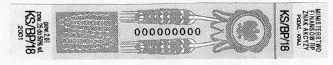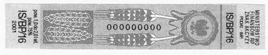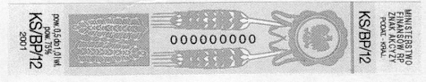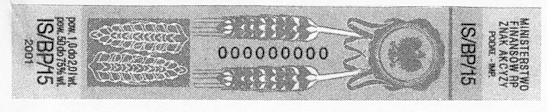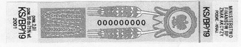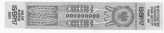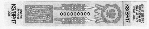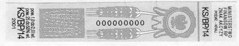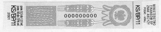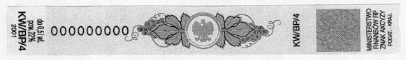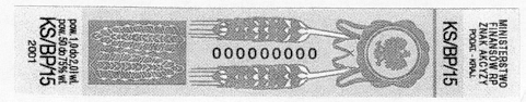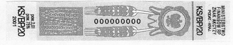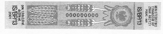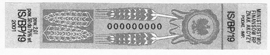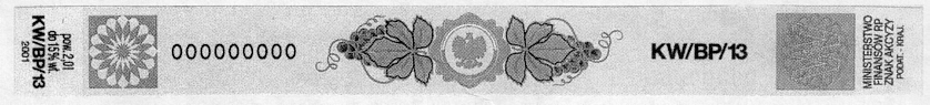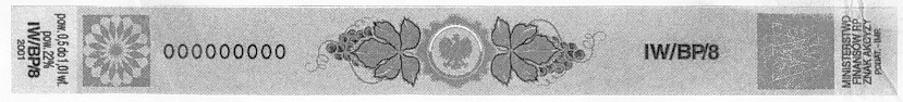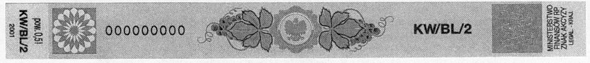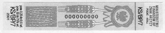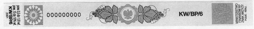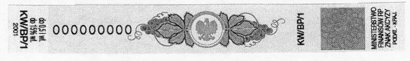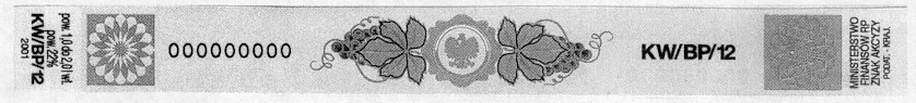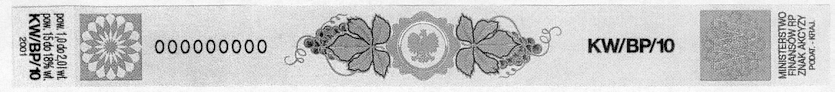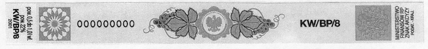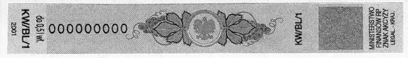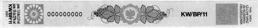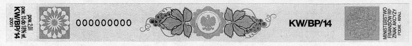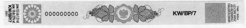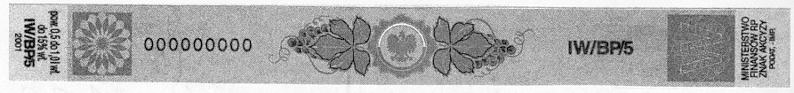 | V.2 | 5-20 | Banderola jest zadrukowana jednostronnie i ma wykonane techniką offsetową dwukolorowe tło: jasnozielone (na marginesach) i ciemniejsze zielone (w centralnej części banderoli, nieobejmujące marginesów), napisy koloru czarnego umieszczone w czterech równoległych wierszach wzdłuż prawego marginesu banderoli: "MINISTERSTWO FINANSÓW RP ZNAK AKCYZY PODAT. - KRAJ." oraz napisy w czterech równoległych wierszach, biegnące wzdłuż lewego marginesu banderoli, określające pojemność opakowania jednostkowego, zawartość procentową alkoholu w wyrobie, serię oraz rok wytworzenia banderoli, dodatkowo równolegle do prawego marginesu banderoli oznaczenie serii, a w centralnej części banderoli numeru ewidencyjnego2). Banderola ma także wykonane techniką wklęsłodrukową dwie rozety koloru zielonego: w kształcie orła z dwoma kłosami umieszczoną po prawej stronie banderoli i rozetę prostokątną z dwoma kłosami, z widocznym efektem kątowym w postaci litery "S", umieszczoną po lewej stronie banderoli, powtarzający się mikrotekst negatywowo-pozytywowy "RZECZPOSPOLITA POLSKA MINISTERSTWO FINANSÓW" wokół orła i mikrotekst pozytywowy "RZECZPOSPOLITA POLSKA MINISTERSTWO FINANSÓW" na liściach kłosów oraz mikrotekst negatywowo-pozytywowy "POLSKA MF", prostopadły do dłuższego boku banderoli przy prawym marginesie banderoli, a także mikrotekst pozytywowy "POLSKA MF" wokół prostokątnej rozety, włókna zabezpieczające widoczne w kolorze bordowym, granatowym i zielonym | 90 | 16 |