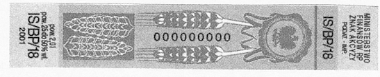| I | Rys. | Banderola jest zadrukowana jednostronnie i ma wykonane techniką offsetową dwukolorowe tło: jasnoniebieskie (na marginesach) i ciemniejsze niebieskie (w centralnej części banderoli, nieobejmujące marginesów), napisy koloru czarnego umieszczone w czterech równoległych wierszach wzdłuż prawego marginesu banderoli: "MINISTERSTWO FINANSÓW RP ZNAK AKCYZY PODAT. - IMP." oraz w dwóch równoległych wierszach biegnących wzdłuż lewego marginesu banderoli: "PAPIEROSY IMP. - 2001" ("2001" stanowi przykład określenia roku wytworzenia banderoli), w dolnej części banderoli, pod rozetą oznaczenie serii i numeru ewidencyjnego2), rozetę koloru granatowego, powtarzający się mikrotekst negatywowo-pozytywowy "RZECZPOSPOLITA POLSKA MINISTERSTWO FINANSÓW" wokół orła i mikrotekst pozytywowy "POLSKA MF" okalający górną część rozety, zabezpieczenie w lewym dolnym rogu banderoli wykonane farbą termochromową - pod wpływem temperatury staje się widoczny jasny element w postaci "łezki"4), włókna zabezpieczające widoczne w kolorze bordowym, granatowym i zielonym | 45 | 22 |