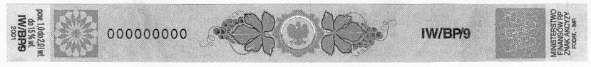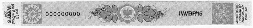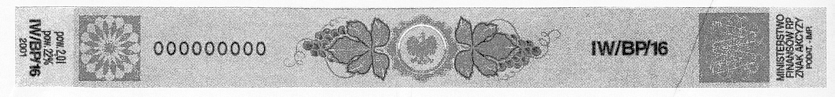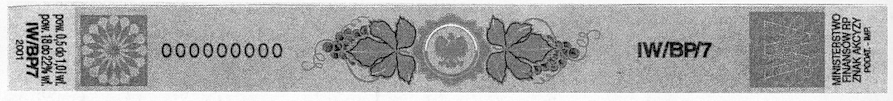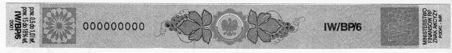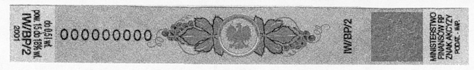 | III.2 | 5-16 | Banderola jest zadrukowana jednostronnie i ma wykonane techniką offsetową dwukolorowe tło: jasnoniebieskie (na marginesach) i ciemniejsze niebieskie (w centralnej części banderoli, nieobejmujące marginesów), napisy koloru czarnego umieszczone w czterech równoległych wierszach wzdłuż prawego marginesu banderoli: "MINISTERSTWO FINANSÓW RP ZNAK AKCYZY PODAT. - IMP." oraz napisy w czterech równoległych wierszach, biegnące wzdłuż lewego marginesu banderoli, określające pojemność opakowania jednostkowego, zawartość procentową alkoholu w wyrobie, serię oraz rok wytworzenia banderoli, dodatkowo po prawej stronie banderoli oznaczenie serii, a po lewej stronie banderoli numeru ewidencyjnego2). Banderola ma także trzy rozety koloru granatowego: w kształcie orła z liśćmi i gronami winorośli, jedną umieszczoną w centralnej części banderoli, drugą znajdującą się po prawej stronie banderoli i trzecią po lewej stronie banderoli, powtarzający się mikrotekst negatywowo-pozytywowy "RZECZPOSPOLITA POLSKA MINISTERSTWO FINANSÓW" wokół orła i mikrotekst negatywowo-pozytywowy "POLSKA MF" na rozecie przy lewym marginesie banderoli, włókna zabezpieczające widoczne w kolorze bordowym, granatowym i zielonym | 160 | 16 |