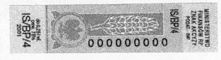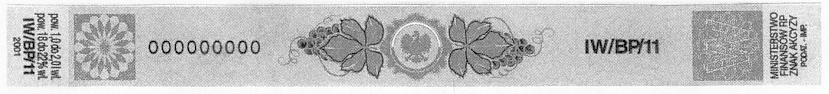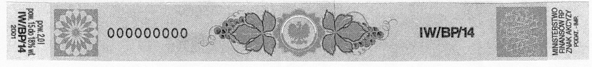 | III.1 | 1-4 | Banderola jest zadrukowana jednostronnie i ma wykonane techniką offsetową dwukolorowe tło: jasnoniebieskie (na marginesach) i ciemniejsze niebieskie (w centralnej części banderoli, nieobejmujące marginesów), napisy koloru czarnego umieszczone w czterech równoległych wierszach wzdłuż prawego marginesu banderoli: "MINISTERSTWO FINANSÓW RP ZNAK AKCYZY PODAT. - IMP." oraz napisy w czterech równoległych wierszach, biegnące wzdłuż lewego marginesu banderoli, określające pojemność opakowania jednostkowego, zawartość procentową alkoholu w wyrobie, serię oraz rok wytworzenia banderoli, dodatkowo równolegle do prawego marginesu banderoli oznaczenie serii, a po lewej stronie banderoli numeru ewidencyjnego2). Banderola ma także dwie rozety koloru granatowego: w kształcie orła z liśćmi i gronami winorośli, jedną umieszczoną w centralnej części banderoli oraz drugą znajdującą się po prawej stronie banderoli, powtarzający się mikrotekst negatywowo-pozytywowy "RZECZPOSPOLITA POLSKA MINISTERSTWO FINANSÓW" wokół orła, włókna zabezpieczające widoczne w kolorze bordowym, granatowym i zielonym | 110 | 14 |