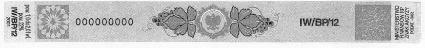 | V.1 | 1-4 | Banderola jest zadrukowana jednostronnie i ma wykonane techniką offsetową dwukolorowe tło: jasnozielone (na marginesach) i ciemniejsze zielone (w centralnej części banderoli, nieobejmujące marginesów), napisy koloru czarnego umieszczone w czterech równoległych wierszach wzdłuż prawego marginesu banderoli: "MINISTERSTWO FINANSÓW RP ZNAK AKCYZY PODAT. - KRAJ." oraz napisy w czterech równoległych wierszach, biegnące wzdłuż lewego marginesu banderoli, określające pojemność opakowania jednostkowego, zawartość procentową alkoholu w wyrobie, serię oraz rok wytworzenia banderoli, dodatkowo równolegle do prawego marginesu banderoli oznaczenie serii, a pod rozetą numeru ewidencyjnego2). Banderola ma także wykonaną techniką wklęsłodrukową rozetę koloru zielonego: w kształcie orła i kłosa z widocznym efektem kątowym w postaci litery "S", powtarzający się mikrotekst negatywowo-pozytywowy "RZECZPOSPOLITA POLSKA MINISTERSTWO FINANSÓW" wokół orła i mikrotekst negatywowo-pozytywowy "POLSKA MF" prostopadły do dłuższego boku banderoli przy lewym marginesie banderoli, a także mikrotekst pozytywowy "POLSKA MF" wokół dwóch boków prostokątnej rozety, włókna zabezpieczające widoczne w kolorze bordowym, granatowym i zielonym | 50 | 12 |