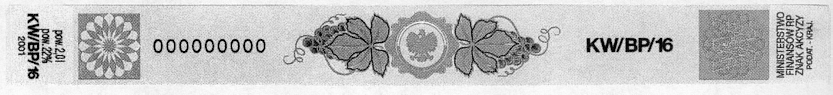 | VI.2 | 5-16 | Banderola jest zadrukowana jednostronnie i ma wykonane techniką offsetową dwukolorowe tło: jasnozielone (na marginesach) i ciemniejsze zielone (w centralnej części banderoli, nieobejmujące marginesów), napisy koloru czarnego umieszczone w czterech równoległych wierszach wzdłuż prawego marginesu banderoli: "MINISTERSTWO FINANSÓW RP ZNAK AKCYZY PODAT. - KRAJ." oraz napisy w czterech równoległych wierszach, biegnące wzdłuż lewego marginesu banderoli, określające pojemność opakowania jednostkowego, zawartość procentową alkoholu w wyrobie, serię oraz rok wytworzenia banderoli, dodatkowo po prawej stronie banderoli oznaczenie serii, a po lewej stronie banderoli numeru ewidencyjnego2). Banderola ma także trzy rozety koloru zielonego: w kształcie orła z liśćmi i gronami winorośli, jedną umieszczoną w centralnej części banderoli, drugą znajdującą się po prawej stronie banderoli i trzecią po lewej stronie banderoli, powtarzający się mikrotekst negatywowo-pozytywowy "RZECZPOSPOLITA POLSKA MINISTERSTWO FINANSÓW" wokół orła i mikrotekst negatywowo-pozytywowy "POLSKA MF" na rozecie przy lewym marginesie banderoli, włókna zabezpieczające widoczne w kolorze bordowym, granatowym i zielonym | 160 | 16 |