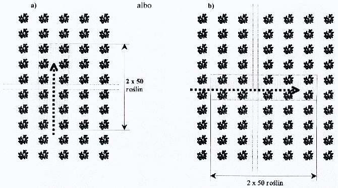 2) na pierwszych dziesięciu jednostkach wykonuje się próbę metryczną, polegającą na policzeniu roślin na 1 mb rzędu, według schematu: