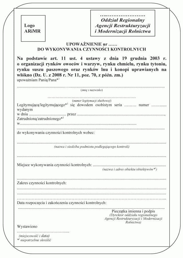 | Tytuł: | Wzór imiennego upoważnienia do wykonywania czynności kontrolnych oraz warunki, jakie powinny spełniać jednostki organizacyjne, którym można powierzyć przeprowadzenie kontroli. |