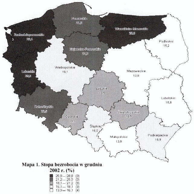 Mapa 1. Stopa bezrobocia wg województw; stan na koniec 2002 r. (w nawiasach liczba województw)
