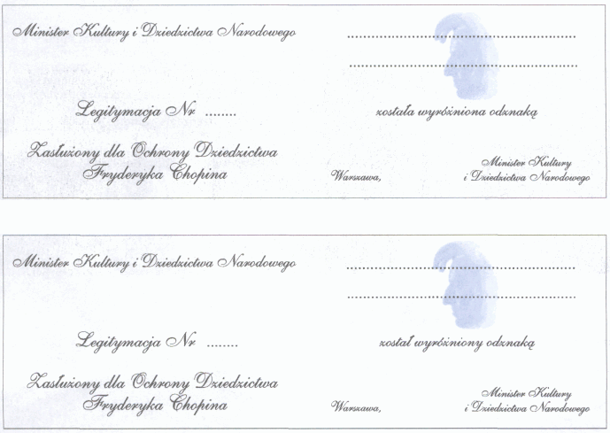 | Tytuł: | Odznaka honorowa "Zasłużony dla Ochrony Dziedzictwa Fryderyka Chopina". |
