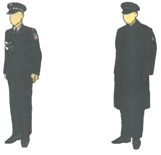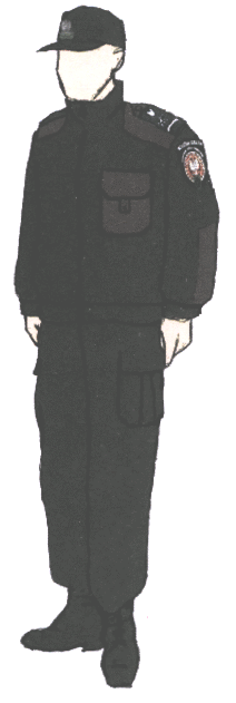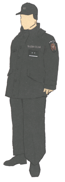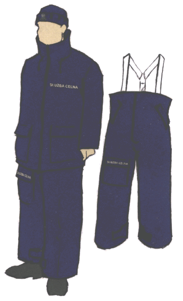 | Kurtka całoroczna koloru szarozielonego z odpinaną podpinką oraz bezrękawnikiem; zamiennie dla funkcjonariuszy na stanowiskach kierowników komórek organizacyjnych płaszcz | tkanina zewnętrzna nylon, podpinka ocieplana 100 g/m2; płaszcz typu frencz z tkaniny carmen (67 % poliester, 33 % wiskoza), 260 g/m2, z podszewką (50 % AC, 50 % CV) |