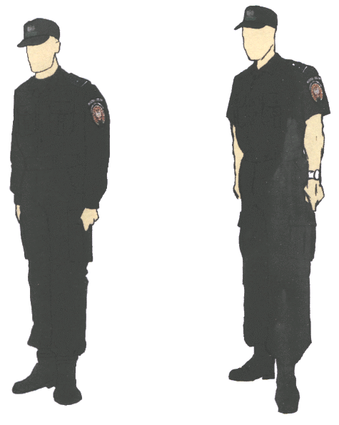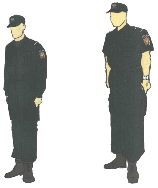 6. Sweter służbowy typu polar w kolorze ciemnozielonym lub czarnym wykonany z materiału polar, wzmocniony tkaniną w przedniej i tylnej części barków oraz na łokciach rękawów. Z tej samej tkaniny naszyte nakładane kieszenie z patkami na lewej piersi i lewym rękawie oraz naramienniki.