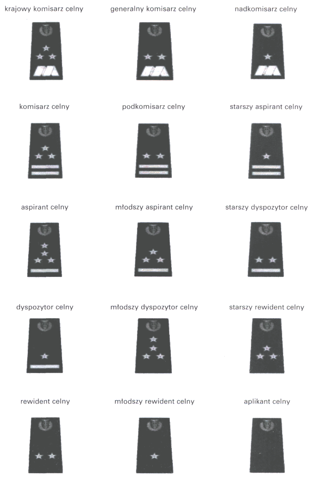 1) krajowy komisarz celny, generalny komisarz celny, nadkomisarz celny, komisarz celny, podkomisarz celny, starszy aspirant celny - dwa płaskie sznury koloru srebrnego, szerokości 6 mm;