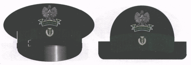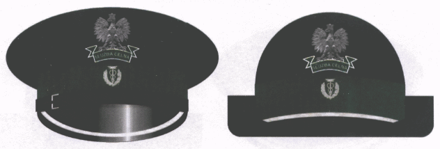 1. Czapka służbowa wykonana jest z gabardyny w kolorze szarozielonym, z otokiem aksamitnym koloru ciemnozielonego, o wysokości ronda 5 cm. Daszek lakierowany na czarno, nad daszkiem jest pasek skórzany koloru czarnego, o szerokości 1,3 cm, przypięty do otoku dwoma małymi guzikami. Na czapce nad otokiem umieszczony jest wizerunek orła ze wstęgą z napisem "SŁUŻBA CELNA", w kolorze srebrnym, tłoczony w metalu lub, w przypadku czapki kierownika komórki organizacyjnej, haftowany mechanicznie. Rondo czapki powinno zawierać usztywniacz zapewniający regularny owal. Zabrania się wyjmowania usztywniacza z czapki. Czapkę nosi się prosto nałożoną na głowę. Krawędź daszka powinna znajdować się na wysokości około 2 cm nad linią brwi.