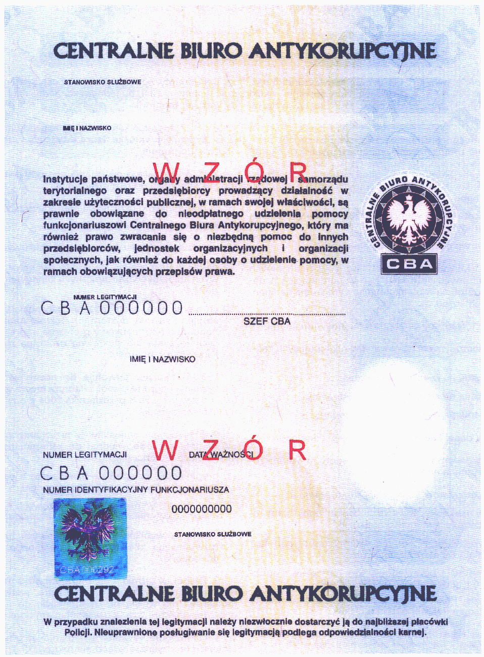 | Tytuł: | Wzór legitymacji służbowej funkcjonariuszy Centralnego Biura Antykorupcyjnego. |