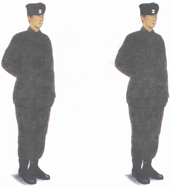 1) wojsk lądowych z oznakami stopni wykonanymi metodą tłoczenia na tkaninie, czapką polową wykonaną z tkaniny typu "pantera", z emblematem "STRAŻ GRANICZNA", z napisem w kolorze białym - w Komendzie Głównej Straży Granicznej, w ośrodkach szkolenia Straży Granicznej, w oddziałach Straży Granicznej - w Morskim Oddziale Straży Granicznej tylko funkcjonariusze pełniący służbę w placówkach Straży Granicznej,