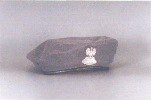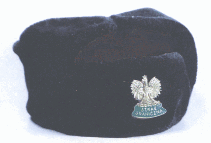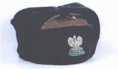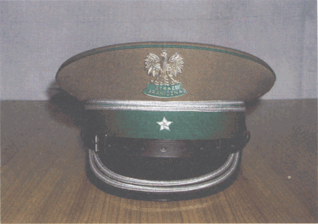 "3) czapkę garnizonową koloru stalowego z czarnym otokiem, zieloną lamówką, czarnym daszkiem, paskiem koloru czarnego oraz metalowym orłem umieszczonym na tarczy, wewnątrz której znajduje się napis "Straż Graniczna" - na wysokości około 30 mm nad linią brwi,