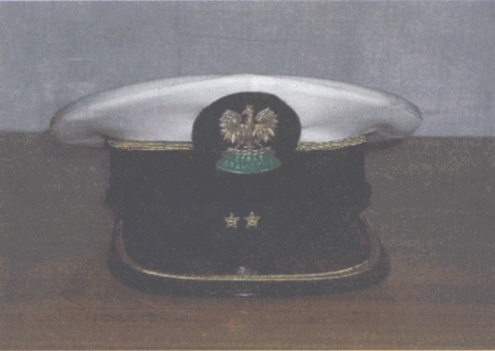 5) czapkę garnizonową letnią z białym denkiem, czarnym otokiem z galonem w kolorze złotym, czarnym daszkiem, paskiem koloru czarnego oraz metalowym orłem umieszczonym na tarczy, wewnątrz której znajduje się napis "Straż Graniczna" - na wysokości około 30 mm nad linią brwi,",