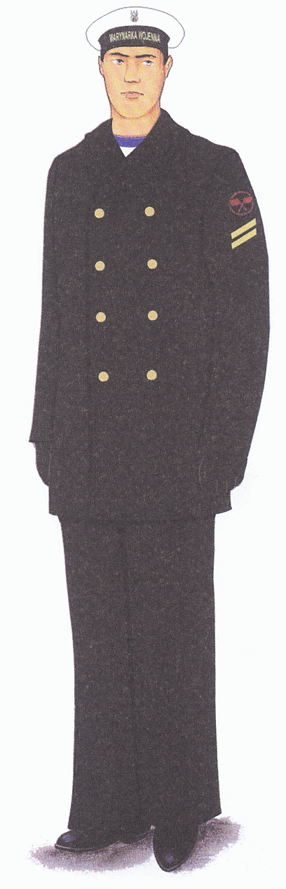 wzórRys. 53. a) Ubiór wyjściowy słuchacza szkoły podoficerskiej Marynarki Wojennej z bluzą letnią i czapką garnizonową