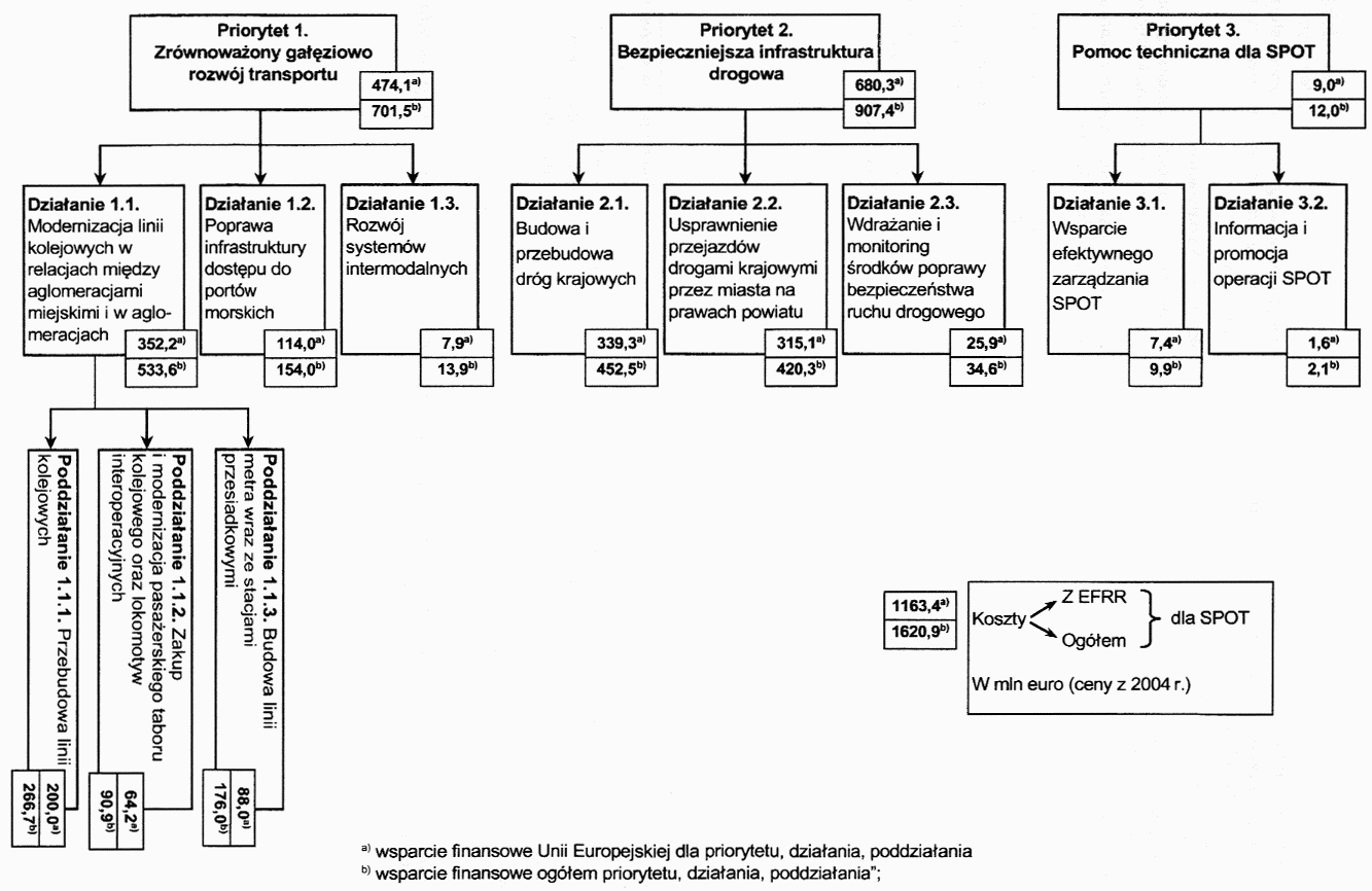 Schemat przedstawiający priorytety, działania i poddziałania SPOT na okres 2004-2006, z uwzględnieniem kwot środków (zobowiązania dla lat 2004-2006 w cenach z 2004 r.), przedstawiono na wykresie 1.