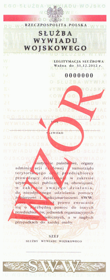 | Tytuł: | Zm.: rozporządzenie w sprawie legitymacji służbowej oraz innych dokumentów Służby Wywiadu Wojskowego. |