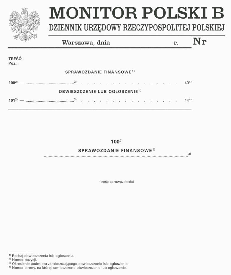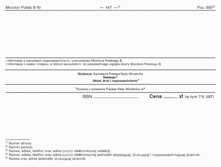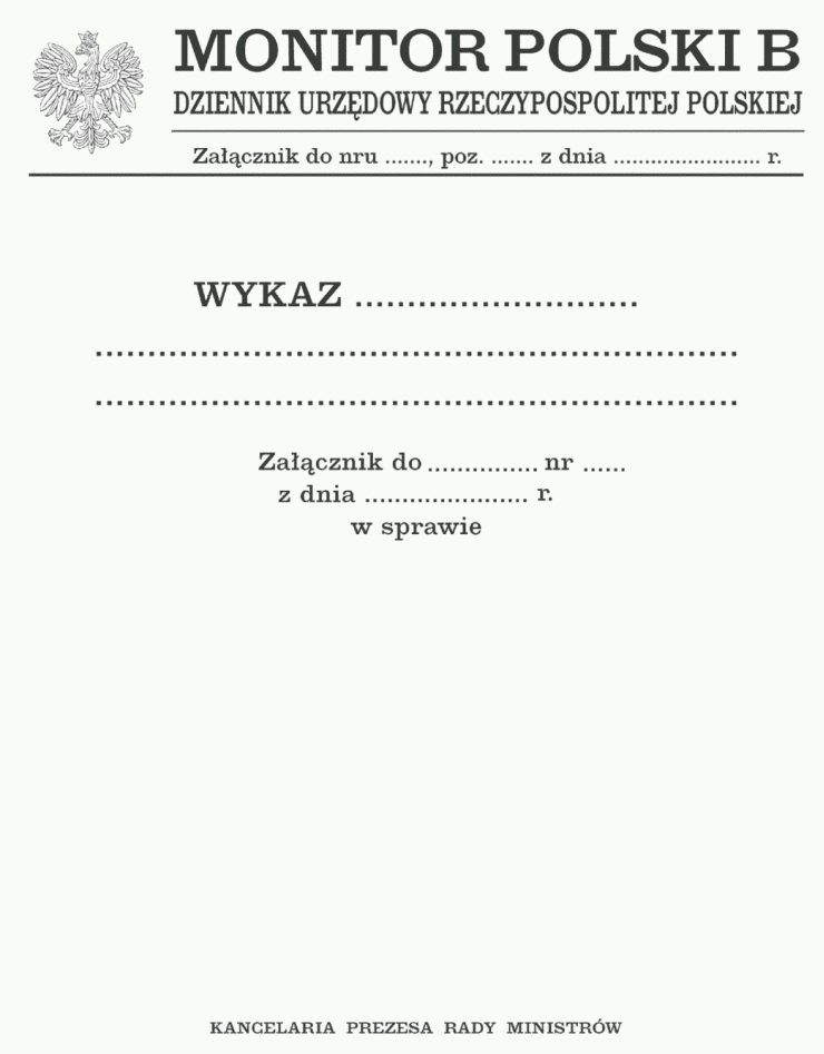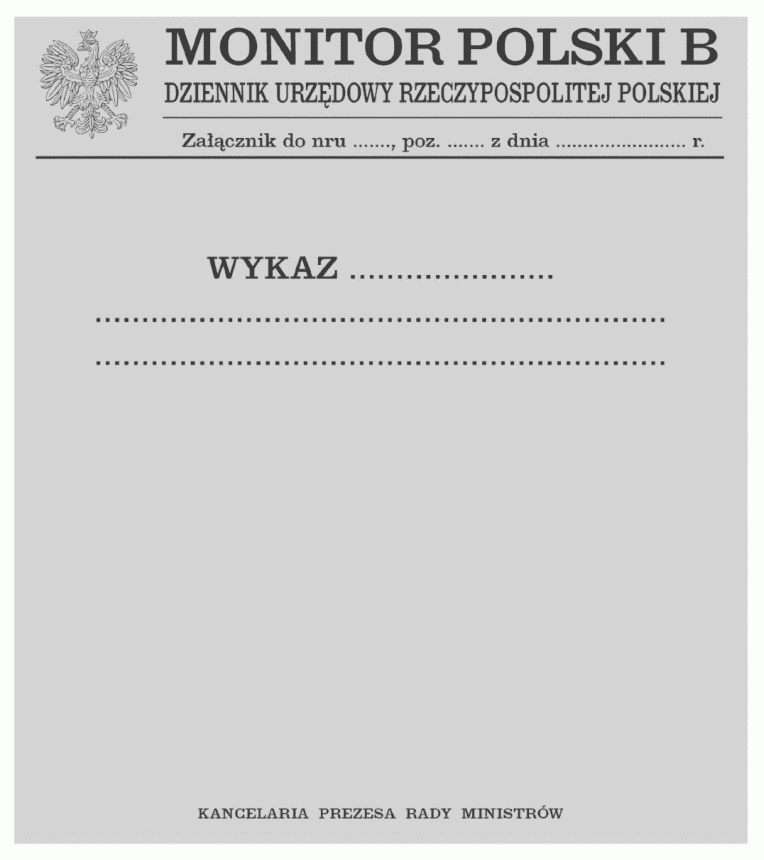 | Tytuł: | Określenie wzoru graficznego winiety dzienników urzędowych oraz pierwszej i ostatniej strony Dziennika Urzędowego Rzeczypospolitej Polskiej "Monitor Polski B", a także wzoru okładek i strony tytułowej załączników do tego dziennika urzędowego. |