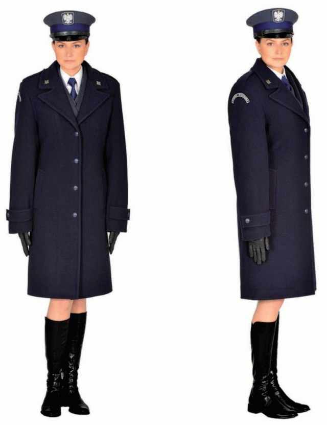 Ubiór funkcjonariusza kobiety w płaszczu wyjściowym zimowym, oficerkach damskich i w czapce wyjściowej