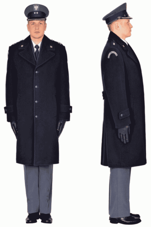 Ubiór funkcjonariusza mężczyzny w płaszczu wyjściowym zimowym, półbutach wyjściowych i w czapce wyjściowej