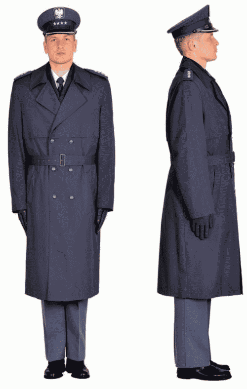 Ubiór funkcjonariusza mężczyzny w płaszczu wyjściowym letnim, półbutach wyjściowych i w czapce wyjściowej