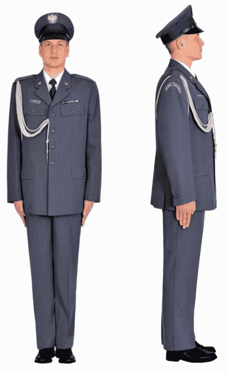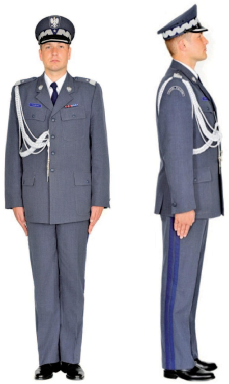 Ubiór funkcjonariusza mężczyzny w mundurze wyjściowym ze sznurem galowym, półbutach wyjściowych i w czapce wyjściowej