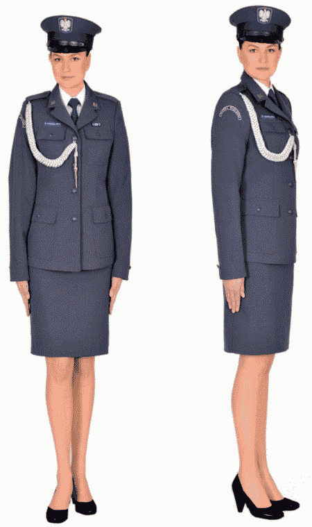 Ubiór funkcjonariusza kobiety w mundurze wyjściowym ze sznurem galowym, półbutach wyjściowych i w czapce wyjściowej