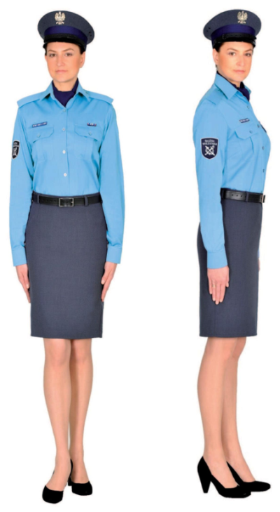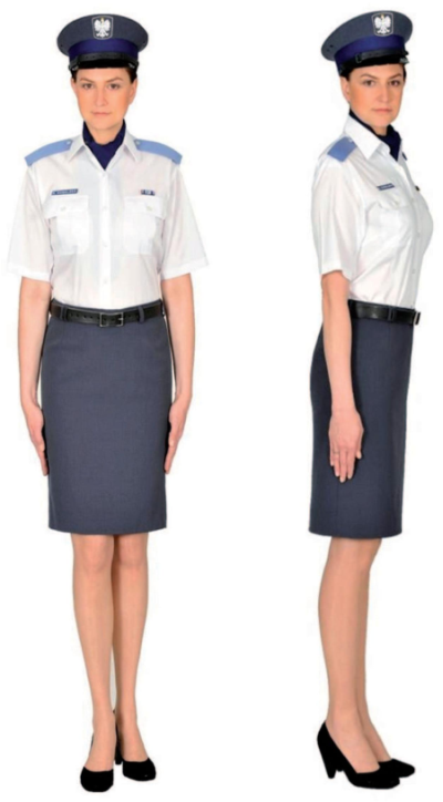 Ubiór funkcjonariusza kobiety w koszuli służbowej, spódnicy letniej i w czapce służbowej