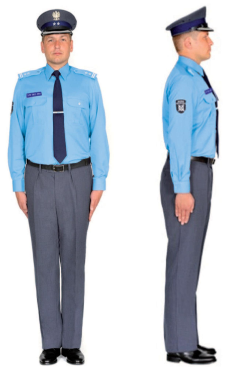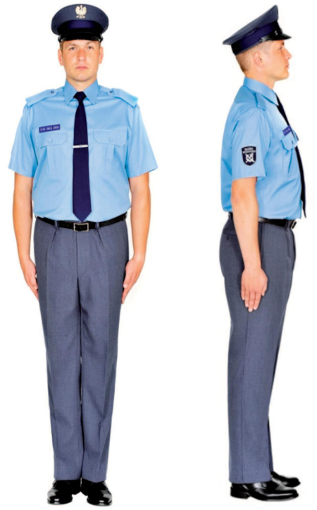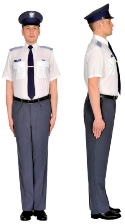Ubiór funkcjonariusza mężczyzny w koszuli służbowej letniej, spodniach letnich i w czapce służbowej