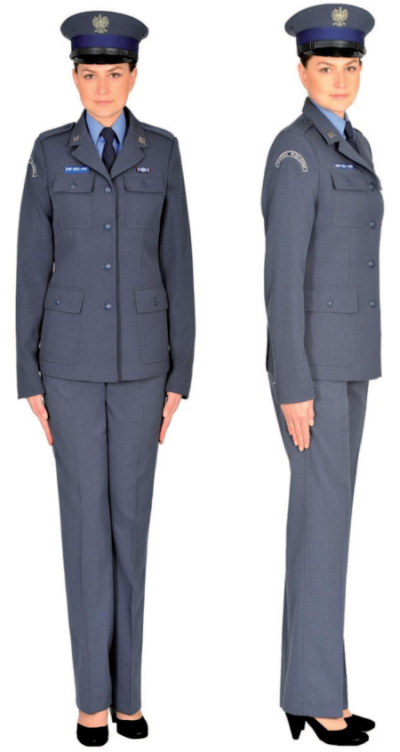 Ubiór funkcjonariusza kobiety w mundurze służbowym, półbutach służbowych i w czapce służbowej