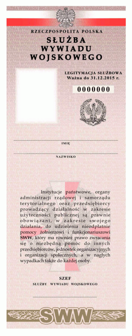 | Tytuł: | Zm.: rozporządzenie w sprawie legitymacji służbowej oraz innych dokumentów Służby Wywiadu Wojskowego. |