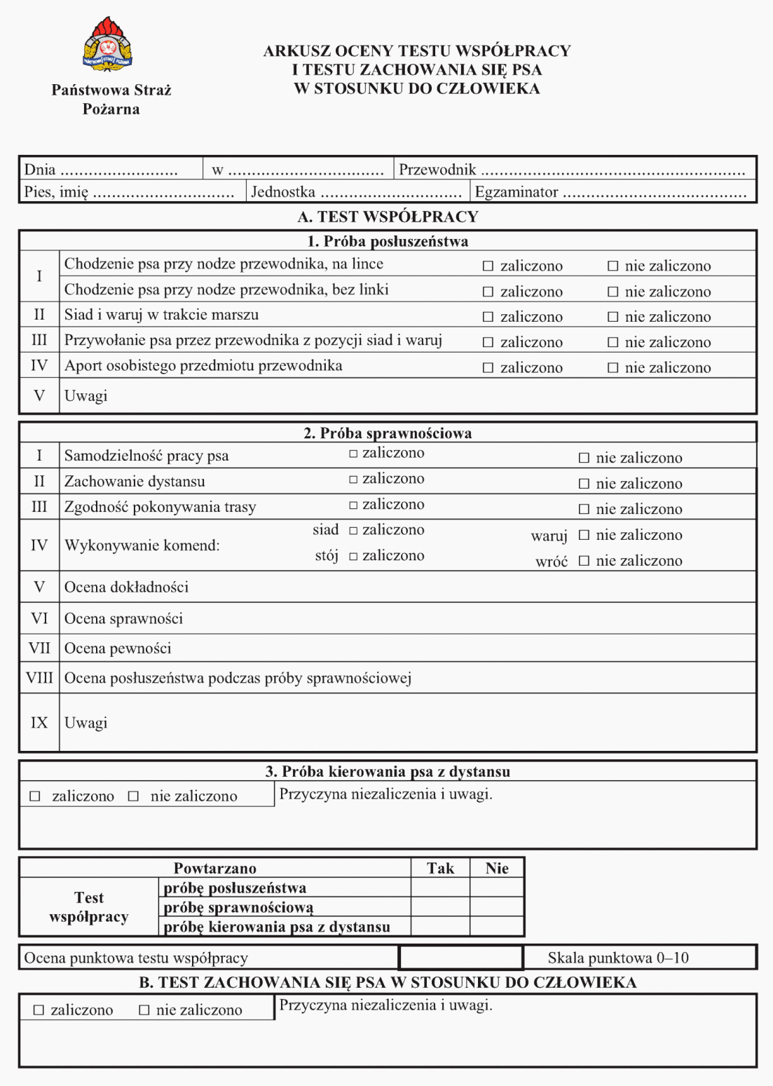 2. Test uznaje się za niezaliczony w przypadku celowego użycia, w stosunku do egzaminatora lub jego ubrania, przez psa zębów, pazurów albo gdy pies zachowuje się agresywnie.