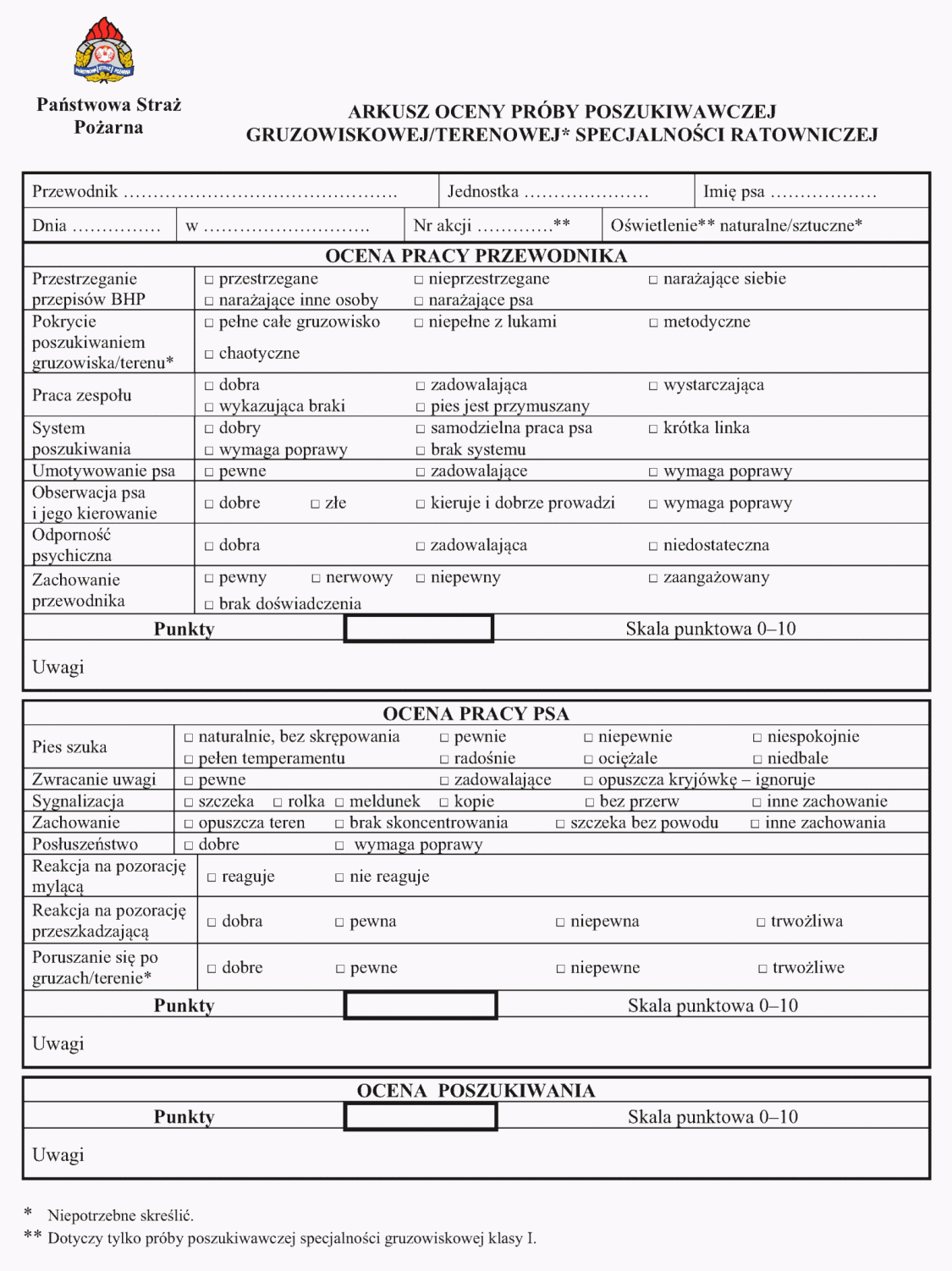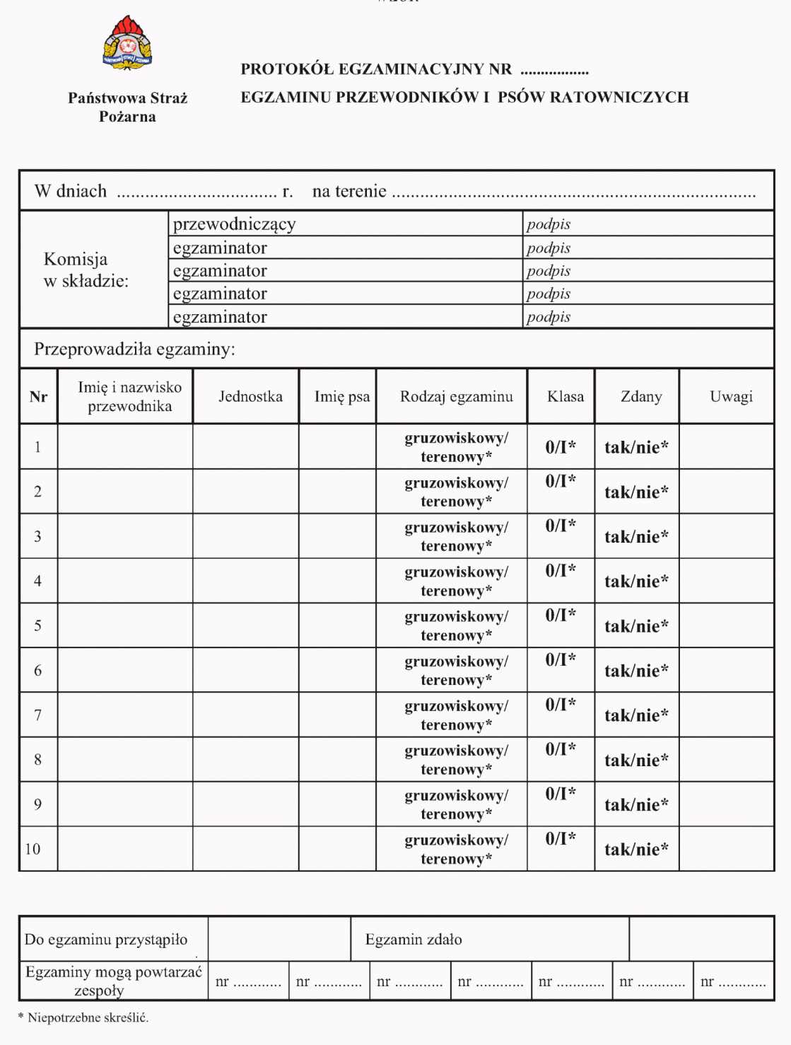 4. Po marszobiegu przewodnik melduje się u przewodniczącego komisji egzaminacyjnej, który ma obowiązek zapoznać go z sytuacją i wręczyć mu kopię fragmentu mapy drzewostanowej lub topograficznej (w skali 1:10 000 lub zbliżonej), obejmującego wyznaczony obiekt, w którym przeprowadza się egzamin, i otulinę (minimum osiem oddziałów otaczających), następnie wprowadza psa ratowniczego na teren próby poszukiwawczej i kieruje go do pracy poszukiwawczej.