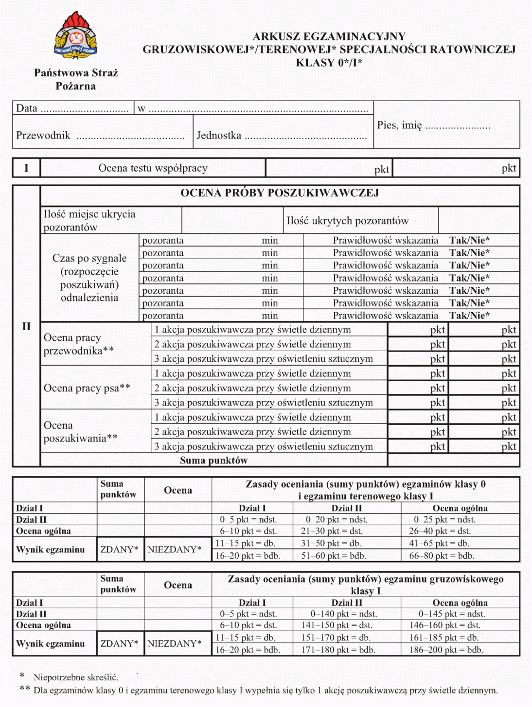 C. Szczegółowy przebieg próby poszukiwawczej terenowej klasy 0 i I
