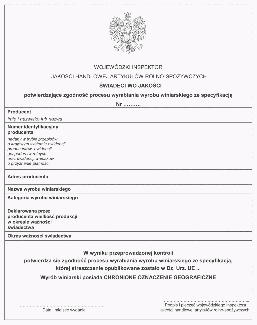 | Tytuł: | Wzór świadectwa jakości potwierdzającego zgodność procesu wyrabiania wyrobu winiarskiego ze specyfikacją. |