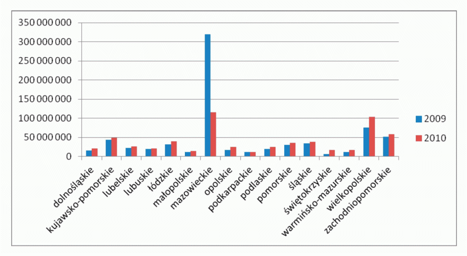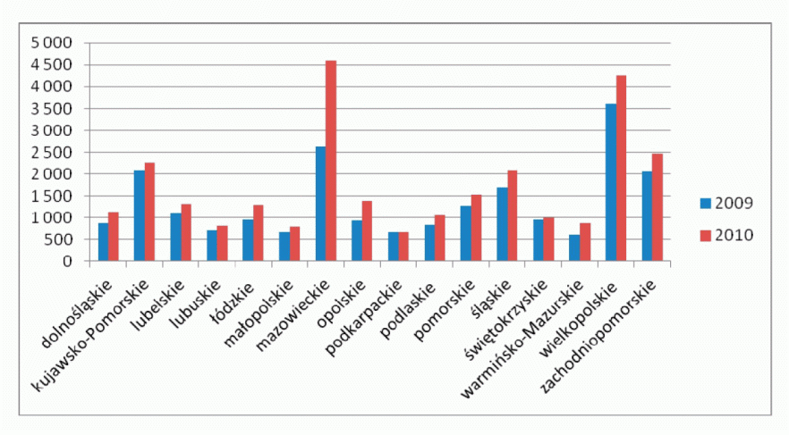 Rys. 3. Liczba brojlerów w 2009-2010 w poszczególnych województwach (Źródło: Inspekcja Weterynaryjna)
