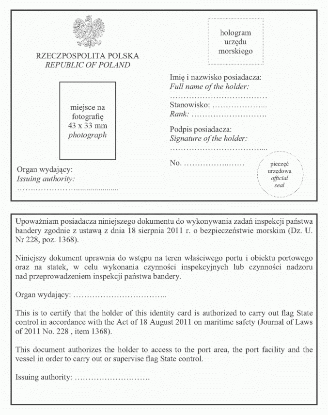 | Tytuł: | Dokument identyfikacyjny inspektora inspekcji państwa bandery oraz osoby wykonującej czynności nadzoru nad przeprowadzaniem inspekcji państwa bandery. |