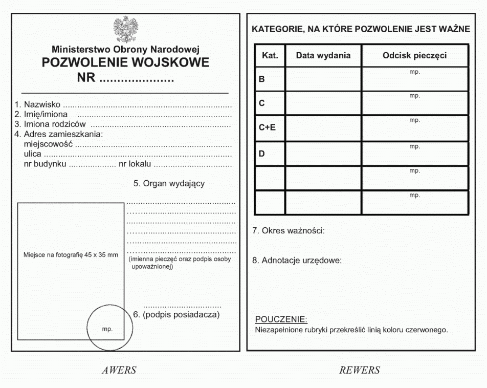 | Tytuł: | Wzór i opis pozwolenia wojskowego, a także tryb jego wydawania. |