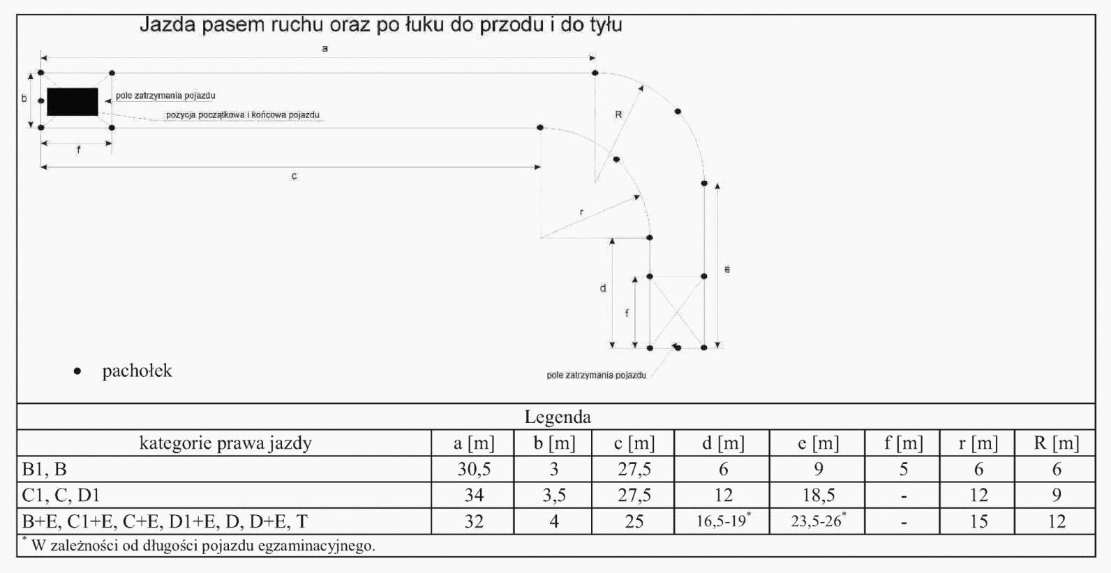 1) upewnienie się o możliwości jazdy: a) wykluczenie prawdopodobieństwa spowodowania zagrożenia w ruchu drogowym, b) ocena sytuacji wokół pojazdu; 2) płynne ruszenie: a) opuszczenie dźwigni hamulca awaryjnego - w przypadku gdy jest uruchomiony, b) łagodne puszczenie sprzęgła, zwiększenie obrotów silnika; 3) dla prawa jazdy kategorii B1, B, C1, C, D1 - płynna jazda pasem ruchu do przodu i tyłu (w przypadku kategorii B i B1 w trakcie jazdy do tyłu obserwacja toru jazdy pojazdu zgodnie z techniką kierowania przez tylną szybę pojazdu i lusterka); 4) dla prawa jazdy kategorii B+E, C1+E, C+E, D1+E, D, D+E, T: a) płynna jazda do przodu pasem ruchu, b) cofanie po prostej i łuku, z możliwością zatrzymywania się i ponawiania jazdy do przodu, w czasie nie dłuższym niż 5 minut; 5) nienajeżdżanie kołem na linie wyznaczające zewnętrzne krawędzie stanowisk (w przypadku kategorii B1 i B nie dotyczy linii wewnętrznych ograniczających i wyznaczających pole zatrzymania pojazdu); 6) nienajeżdżanie na pachołki lub tyczki oraz niepotrącanie ich; 7) zatrzymanie pojazdu przed końcem i początkiem pasa ruchu: a) w przypadku kategorii B1 i B w wyznaczonym polu zatrzymania pojazdu, b) w przypadku pozostałych kategorii w odległości nie większej niż 1 m od linii ograniczającej pas. W przypadku egzaminu w zakresie prawa jazdy kategorii B+E, C1+E, C+E, D1+E, D, D+E, T dopuszcza się jedno opuszczenie pojazdu w czasie wykonywania zadania |