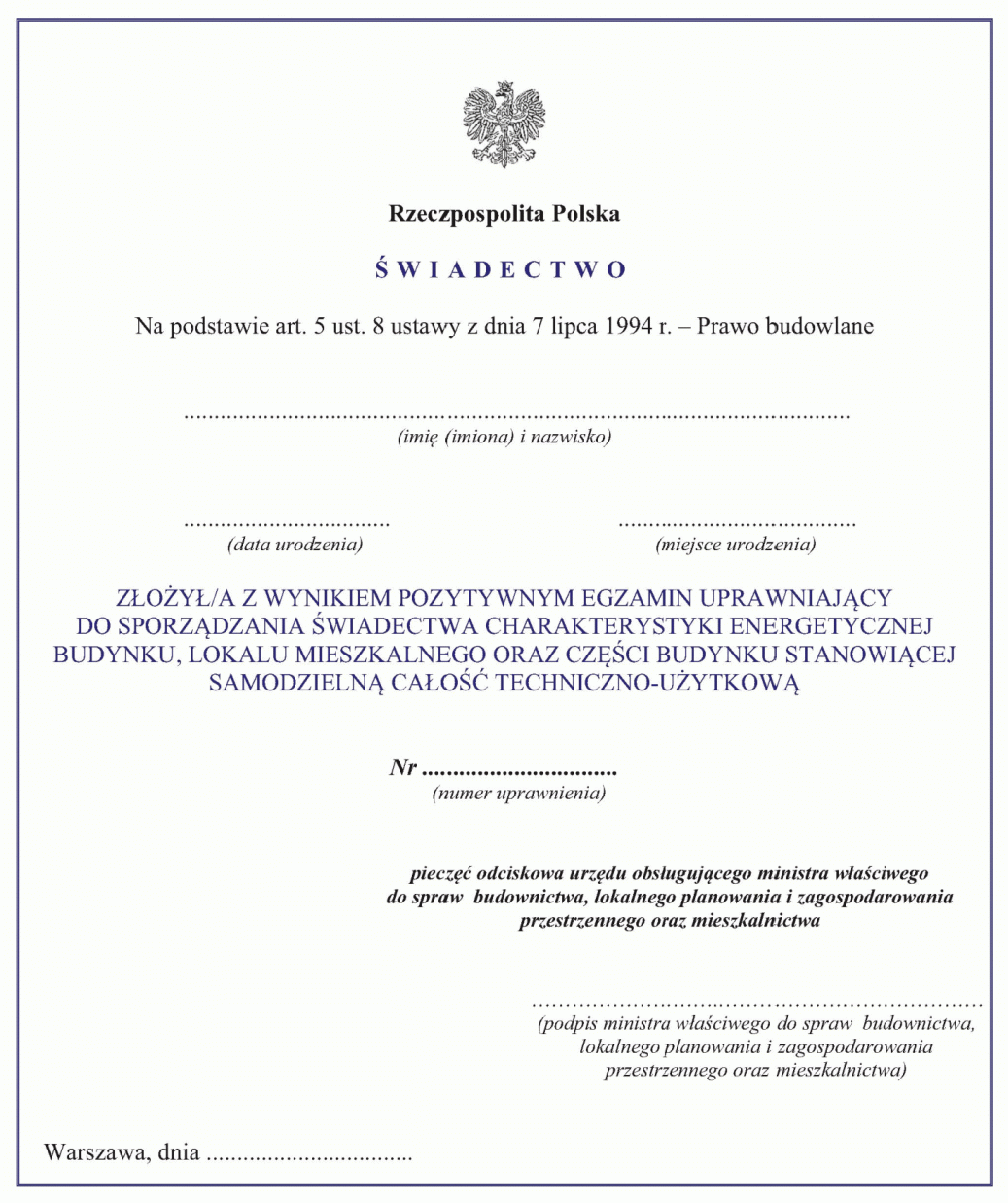 | Tytuł: | Zm.: rozporządzenie w sprawie przeprowadzania szkolenia oraz egzaminu dla osób ubiegających się o uprawnienie do sporządzania świadectwa charakterystyki energetycznej budynku, lokalu mieszkalnego oraz części budynku stanowiącej samodzielną całość techniczno-użytkową. |