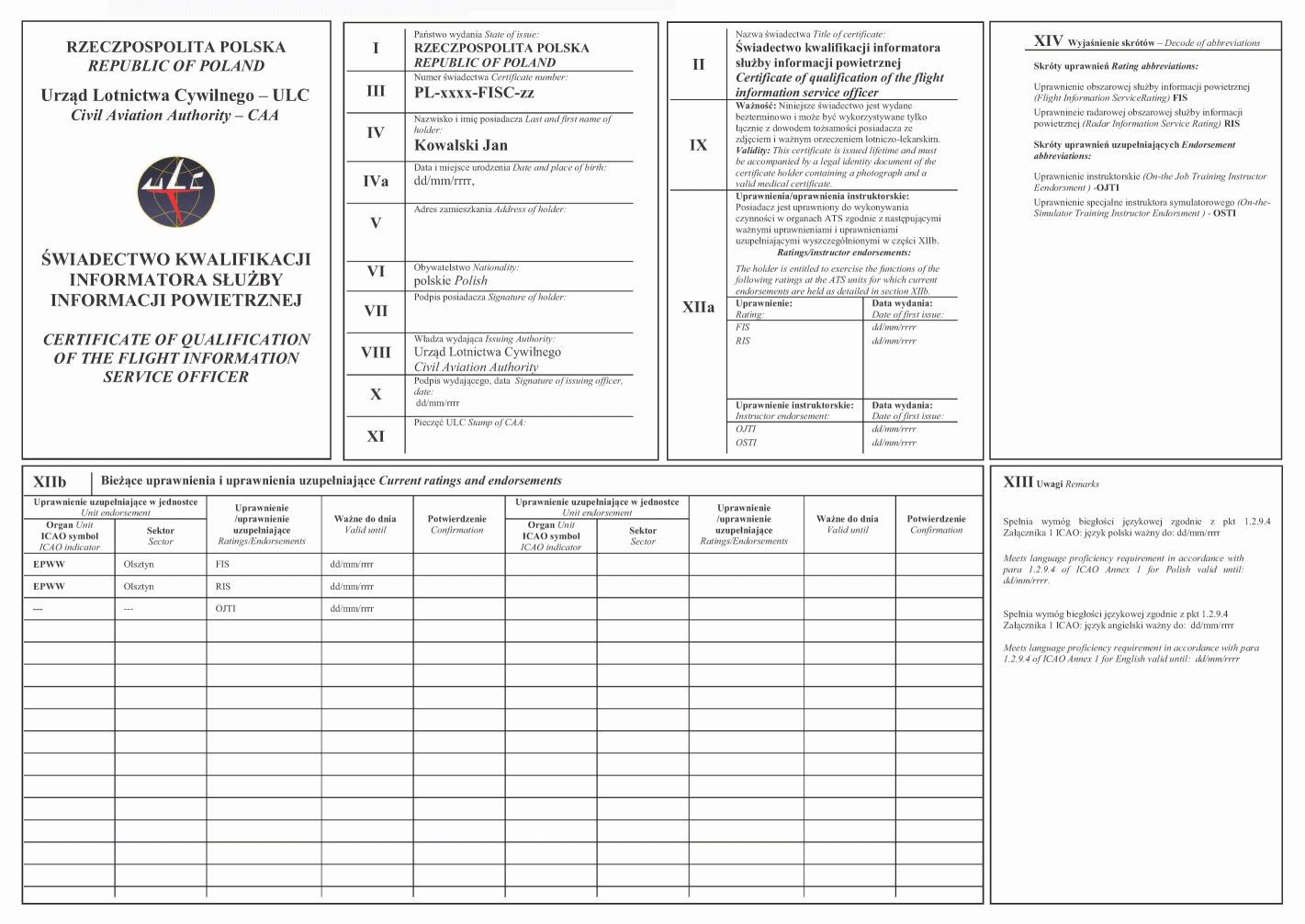 Spełnia wymóg biegłości językowej zgodnie z pkt 1.2.9.4 Załącznika 1 ICAO: język polski ważny do [DATA] |