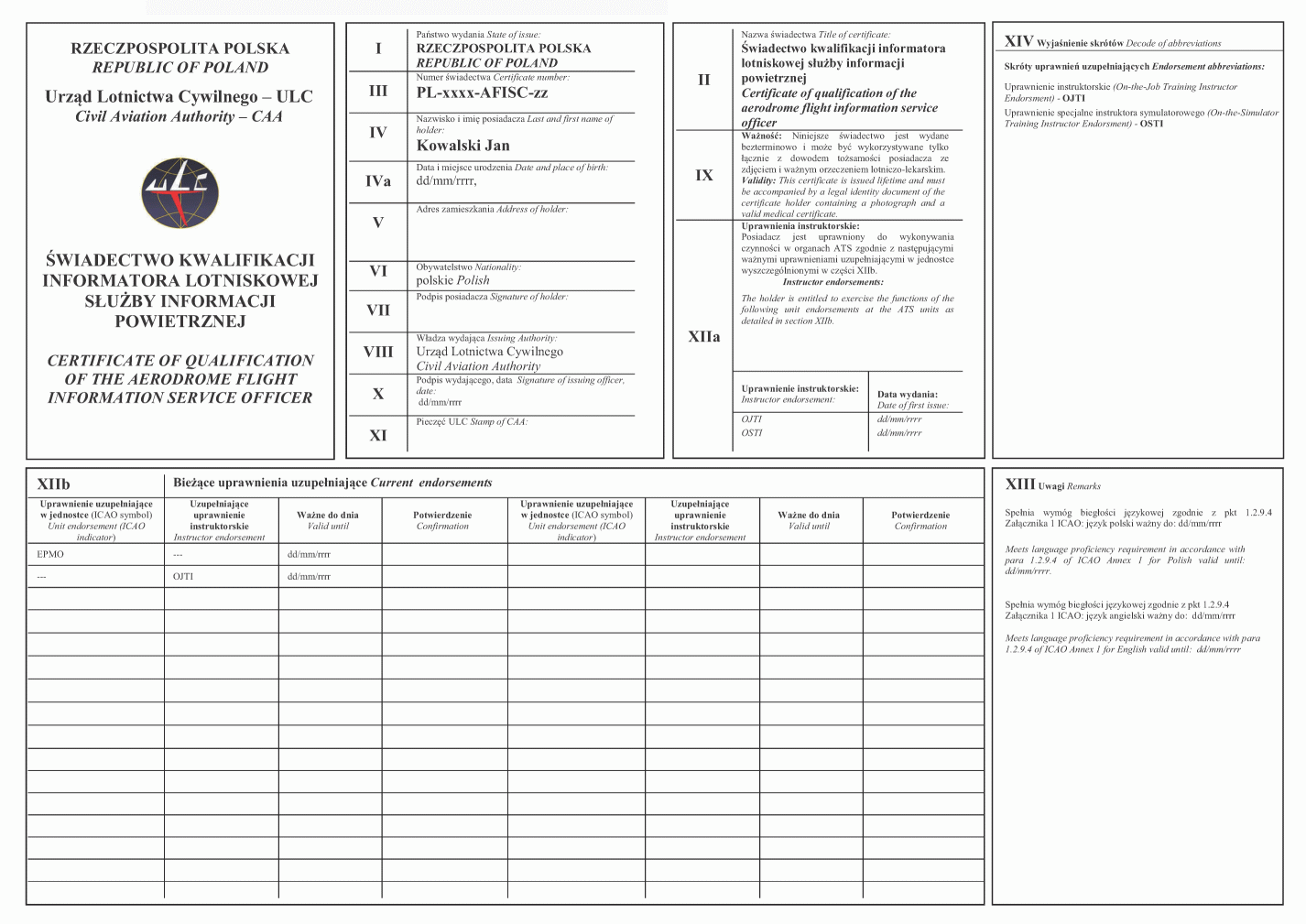 | Wpisy do świadectwa kwalifikacji informatora służby informacji powietrznej | ||||