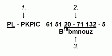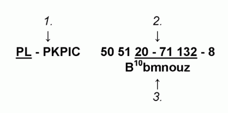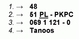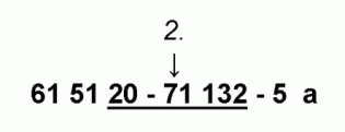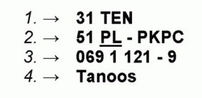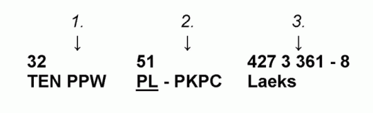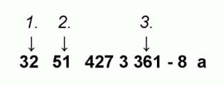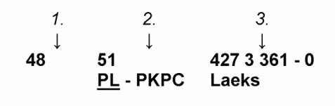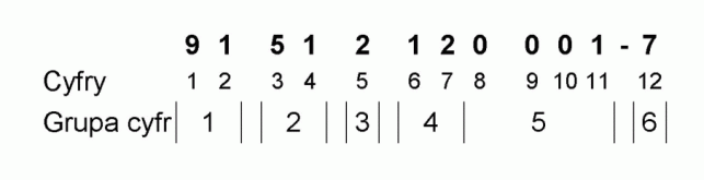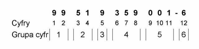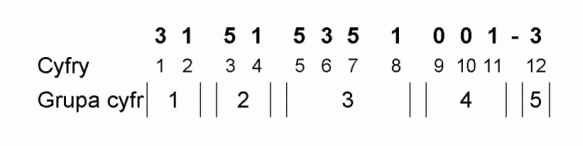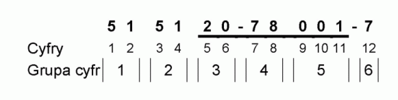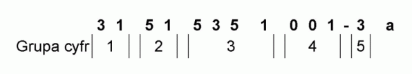 gdzie znaki grup 3, 4 i 5 są podkreślone łącznie z dywizem (krótką kreską) i spacjami, a poszczególne grupy cyfr oznaczają: