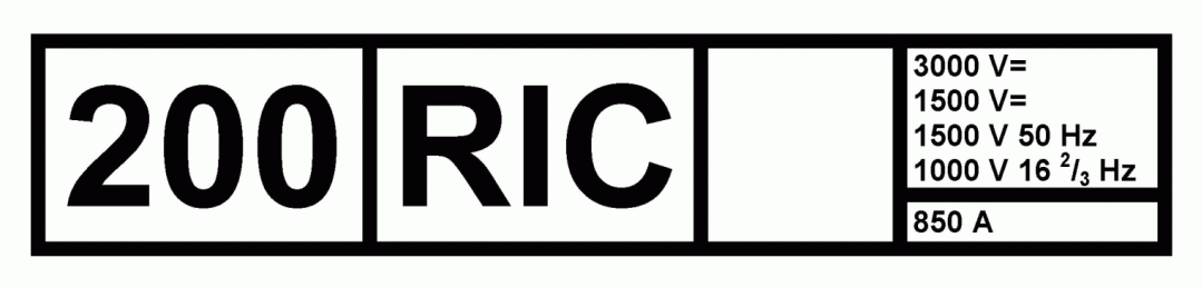 Rys. 2. Przykład wykonania na ostojnicy wagonu pasażerskiego spełniającego wymagania przepisów RIC tabliczki informującej o dopuszczalnej prędkości eksploatacyjnej, napięciu zasilania energią elektryczną składu pociągu i dopuszczalnym obciążeniu prądowym urządzeń zasilających.
