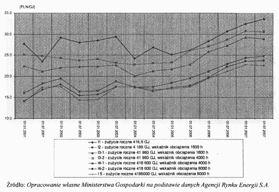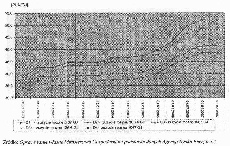 Wykres nr 5. Ewolucja cen gazu ziemnego według kategorii standardowych odbiorców domowych w latach 2001-1.07.2007 (ceny brutto za 1 GJ)