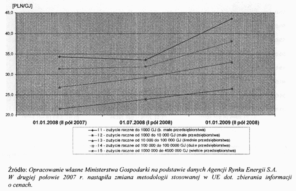 Poniżej przedstawiono ewolucję cen gazu ziemnego według kategorii standardowych przemysłowych odbiorców końcowych i odbiorców domowych w latach 2001-2008 (ceny brutto za 1 GJ). Kategorie standardowych odbiorców (standard consumers) zostały ustalone do celów statystycznych zgodnie z dyrektywą WE z dnia 29 czerwca 1990 r. Nr 90/377/EWG dotyczące wspólnotowej procedury w celu poprawy przejrzystości cen gazu i energii elektrycznej dla końcowych odbiorców przemysłowych (Dz. Urz. UE L 185 z 17.07.1990, str. 16).